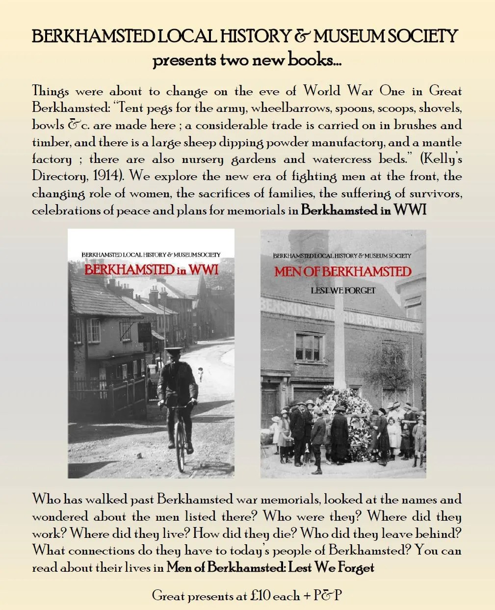 Now retired and spending several weeks each year in Portugal, I’m still researching and writing about Berkhamsted’s local history. In time for the centenary of Armistice Day in 2018, I contributed to the Society’s two books featuring the young men who died in WWI and their families on the home front, now just £5 each + P&P.