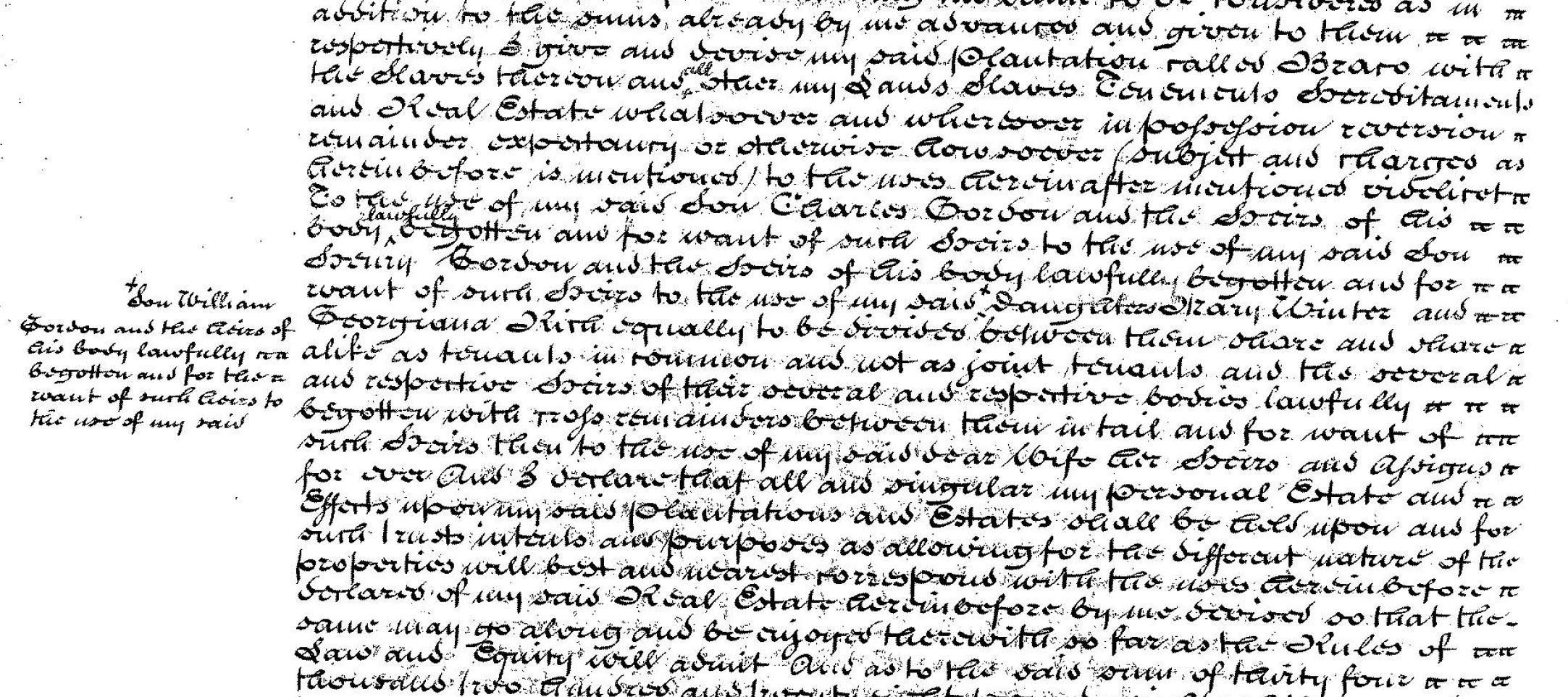 In Charles Gordon’s will, he explained that he left no pecuniary bequest to his son Charles having already advanced him sums “on account of the New Timber estate”. He left Braco in trust for Charles Gordon and bequeathed the principal of the £34,228 8s 3d consolidated annuities (worth nearly £3.5 million today) in trust for his three sons and their heirs after the death of his wife. The Gordon family had indeed prospered from the slave trade.