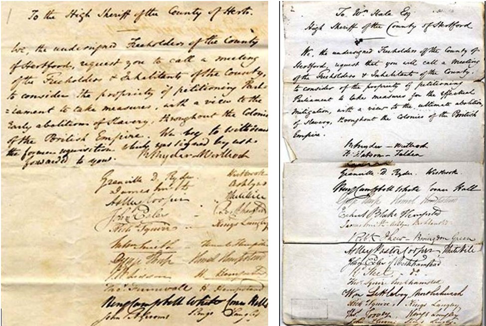 We, the undersigned Freeholders of the County of Hertford, request you to call a meeting of the Freeholders & Inhabitants of the County, to consider the propriety of petitioning Parliament to take measures, with a view to the early abolition of slavery, throughout the Colonies of the British Empire.