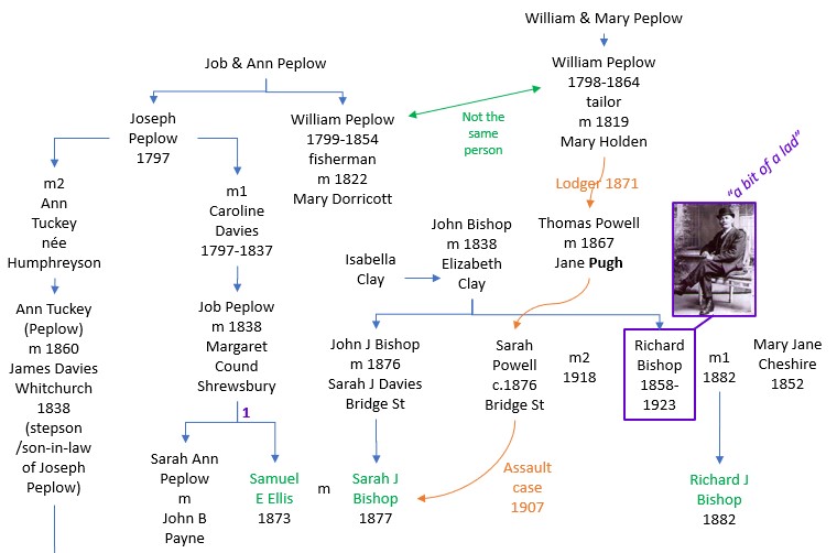 Richard’s father was John Bishop, born in 1813 in Berriew, Montgomeryshire. He married Elizabeth Clay in 1839. Following her marriage at the time of the 1841 census, it appeared that Elizabeth was living with her mother Isabella Clay in Spring Gardens, Shrewsbury along with two of her children, Ann and Charlotte. Meanwhile, John Bishop was living with his widowed mother and siblings close by in Canal Buildings. It transpires that in 1840, according to settlement and removal papers for Berriew: “Examination of Elizabeth Evans, otherwise Bishop, wife of John Bishop. John – the son of Catharine Bishop, now living in St Mary, Shrewsbury – has absconded. Elizabeth’s maiden name was Clay and she had a child by him – Ann Clay – before their marriage, but none after. Statement from Catharine Bishop, widow of John Bishop, stating that her maiden name was Evans. Gave birth to John five weeks before her marriage, hence the change of name. Elizabeth to be removed from St Mary, Shrewsbury to Berriew”. By 1851, John was a railway labourer and the family were living together in Spring Gardens.