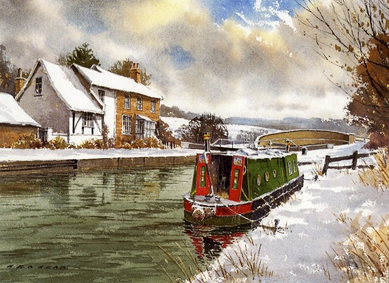 “George Sear (b.1937) is an artist and graphic designer, born in Berkhamsted, Hertfordshire. He has worked in various art studios and London advertising agencies and paints a great deal in the Chilterns, East Anglia and widely throughout the U.K.” (Norfolk Fine Art website). Narrow boat, lock and canal at Dudswell. Card based on an original water colour by George Sear.
