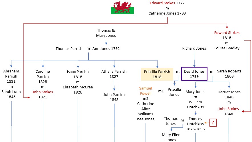 It was at the Pont-y-Blew forge that the iron for the gates to Chirk castle was sourced. Most of the men in this area were coal miners, including Mary’s father David Jones. His first wife was Priscilla Parrish who died at the age of 21 giving birth to her daughter Priscilla. Sarah Roberts was David’s second wife. On both his marriage certificates, David records his father as Richard Jones. In 1851, David was away from home on census night and on 6 Sep 1855, he died from the effects of injuries received in a coalpit; “killed” was written in the margin of church register. Descendants from several of Priscilla’s brothers and sisters lead to many (at least 13) DNA matches, so was David’s father Richard related in some way to Thomas Parrish’s wife Ann née Jones? Stokes names appear to be closely linked to the Parrish and Jones family.
