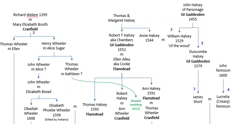 In 1577, Robert Halsey also known as Chambers married Ellen Barrett Alley aka Cooke (why the aliases?) in Flamstead. There was a double wedding when their son and daughter Robert and Ann married Ann and Thomas Wheeler of Cranfield. Another Halsey son Thomas married Elizabeth Phoebe Wheeler who was killed in an arson attack on settlers by Pequot Indians in 1649 in Southampton, Suffolk, New York. Their descendants thrived and their DNA matches mine, but where is the connection with my family?