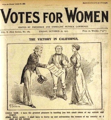 A cartoon in the Votes for Women magazine in 1911 depicts women’s victorious quest for the vote in California, whilst England in the guise of John Bull says “I shall have to hurry up and enfranchise the women of my country or I shall get left behind”.